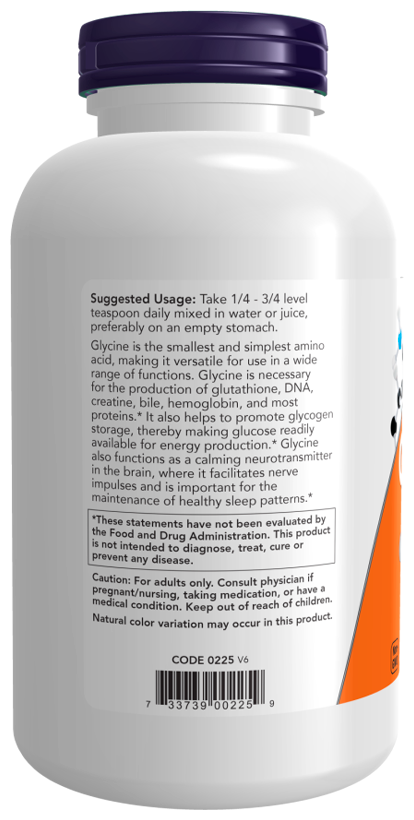 Глицин — это самая маленькая и простая аминокислота, что делает его универсальным для использования в широком спектре функций. Глицин необходим для производства глутатиона, ДНК, креатина, желчи, гемоглобина и большинства белков. Он также способствует накоплению гликогена, тем самым делая глюкозу доступной для выработки энергии.* Глицин также действует как успокаивающий нейромедиатор в головном мозге, где он облегчает передачу нервных импульсов и важен для поддержания здорового режима сна.