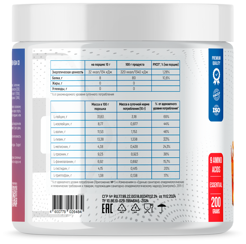 EAA (L-лейцин; L-лизин; L-валин; L-изолейцин; L-треонин; L-фенилаланин; L-гистидин; L-метионин; L-триптофан), подсолнечный лецитин - антиокислитель (E322), лимонная кислота - регулятор кислотности (E330), ароматизатор пищевой «Персик», ароматизатор пищевой «Карамель»,  краситель сахарный колер IV (E150d), сукралоза - подсластитель (E955), агент антислеживающий орто-фосфат кальция 3-замещенный (E341ii), краситель пищевой каротин (E160a).