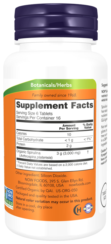 Спирулина - это сине-зеленая микроводоросль, которая содержит натуральный белок, а также другие питательные вещества, такие как витамины, минералы и гамма-линоленовая кислота (ГЛК). Таблетки из сертифицированной органической спирулины от Now - это чистый продукт, не содержащий вспомогательных и связующих веществ или добавок.